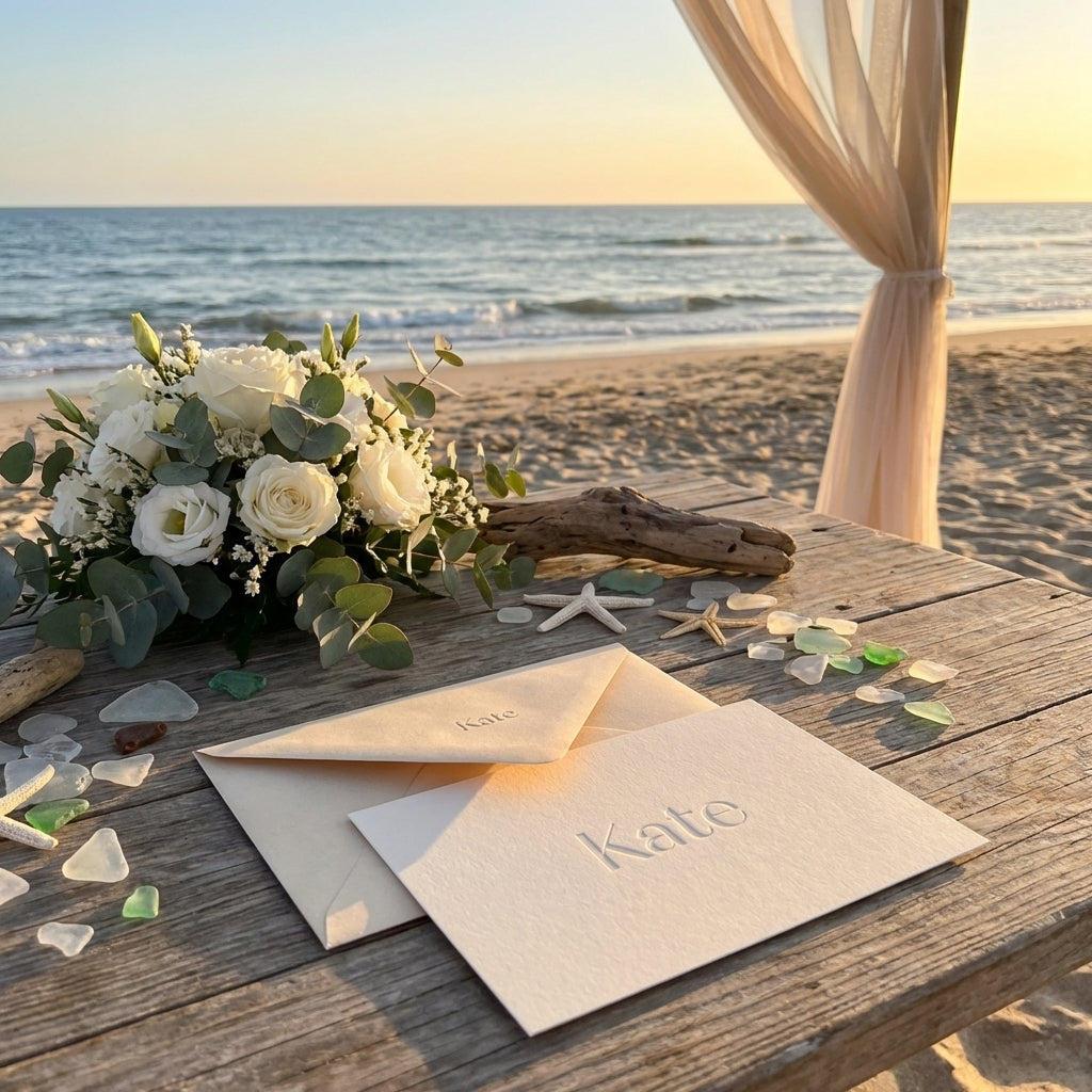 Envelope: Sophisticated beige textured paper.