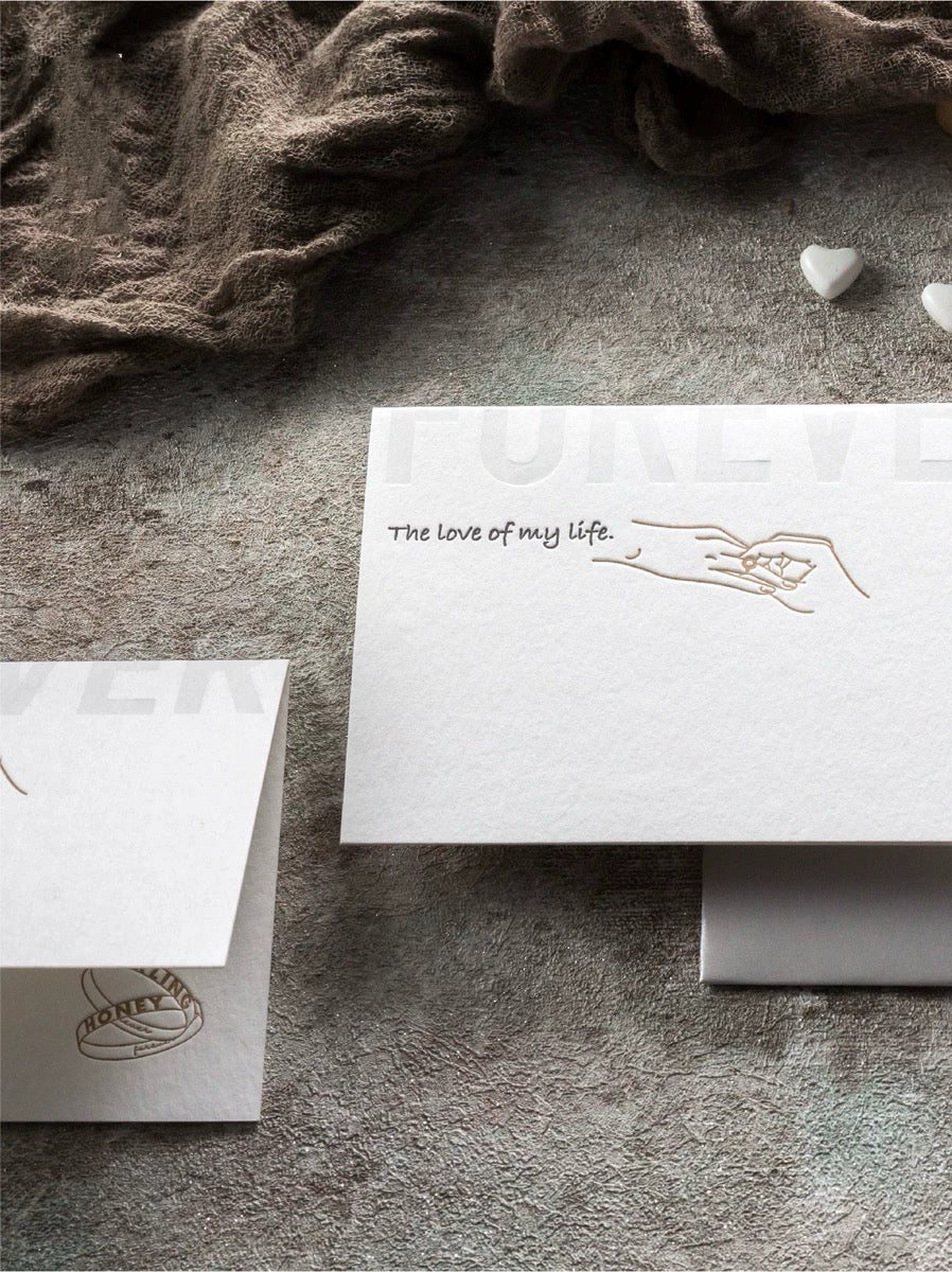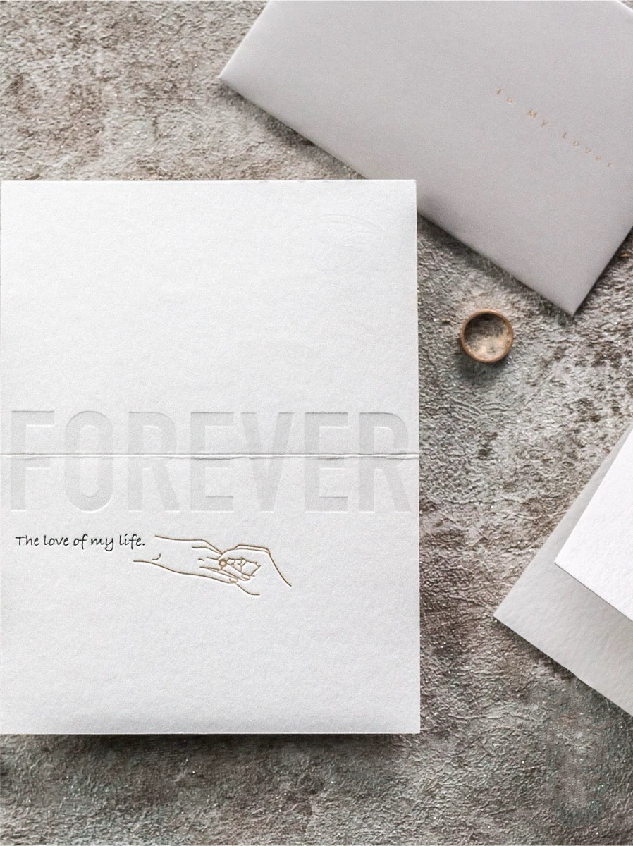 Celebrate eternal love with this beautifully embossed “FOREVER” card. The touching design shows one hand placing a ring on another, symbolizing commitment and devotion. With delicate details and room to write your own message, it’s an elegant choice for anniversaries, proposals, or special gifts. Experience the unmatched quality of 450g wild tissue paper, offering exceptional thickness that is about four times greater than that of standard greeting cards.