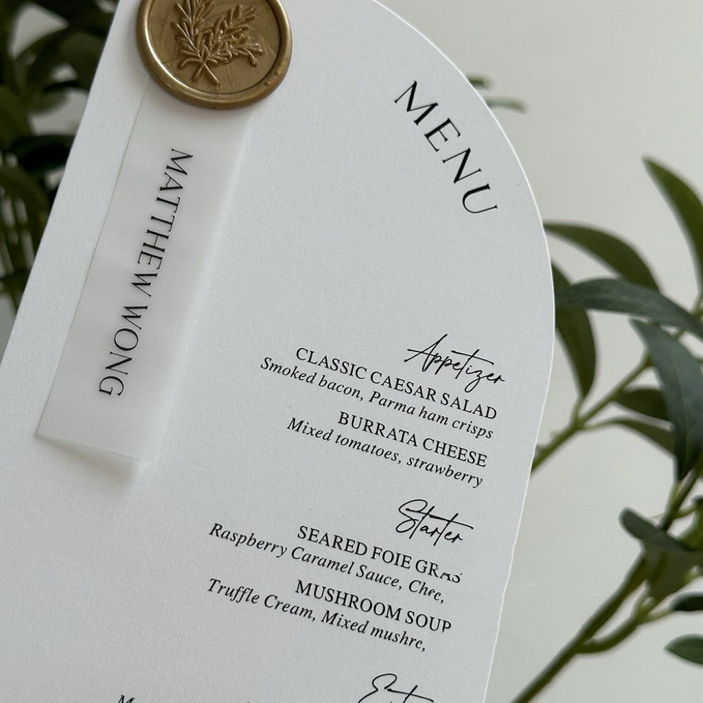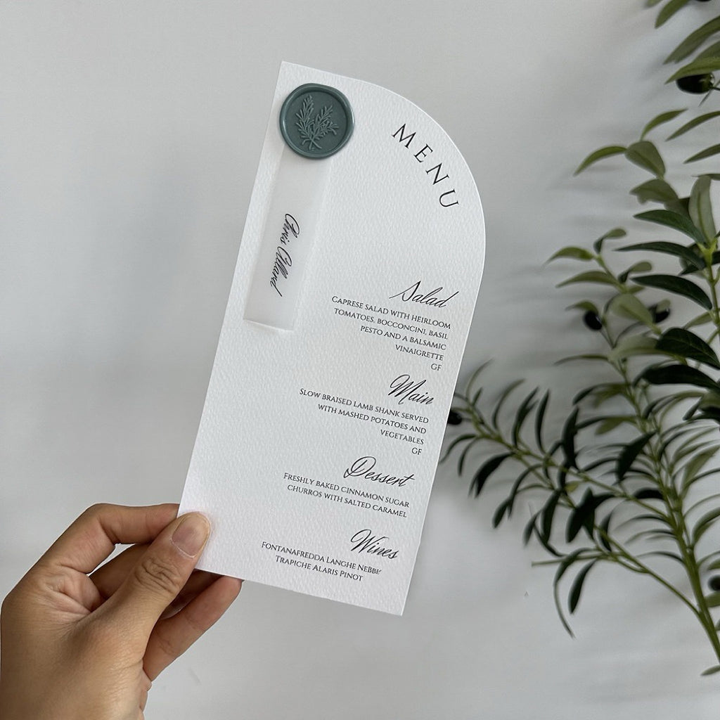 Modern Arc-Top Wedding Menu Card with Wax Seal Name Tag